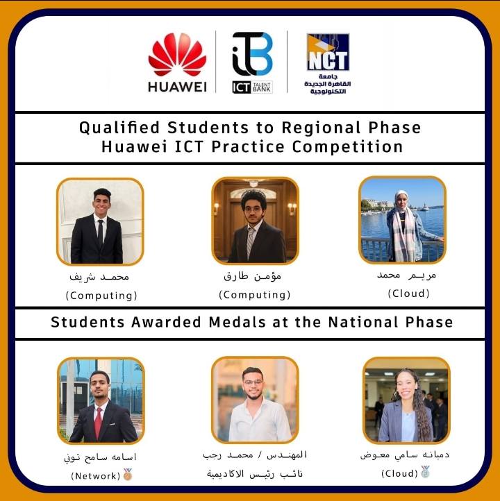 Students from the Communication Technology (ICT) program at the College of Industry and Energy Technology, New Cairo University of Technology, achieved outstanding results in the Huawei ICT Practice Competition. Silver Medal: Damianh Sami – Cloud Track, Group 3 Bronze Medal: Osama Sameh – Network Track, Group 3 Qualified for Regional Stage: Maryam Muhammad, Moumen Tariq, Muhammad Sharif Under the supervision of D. Surface Spray, Director of Huawei Academy at the University, and M. Muhammad Rajab, Deputy Director, the students demonstrated exceptional skills and commitment. Dr. Tariq Abdul Malak, President of the University, congratulated the winners, praising their dedication and excellence, and wishing them continued success in future regional and international competitions.
